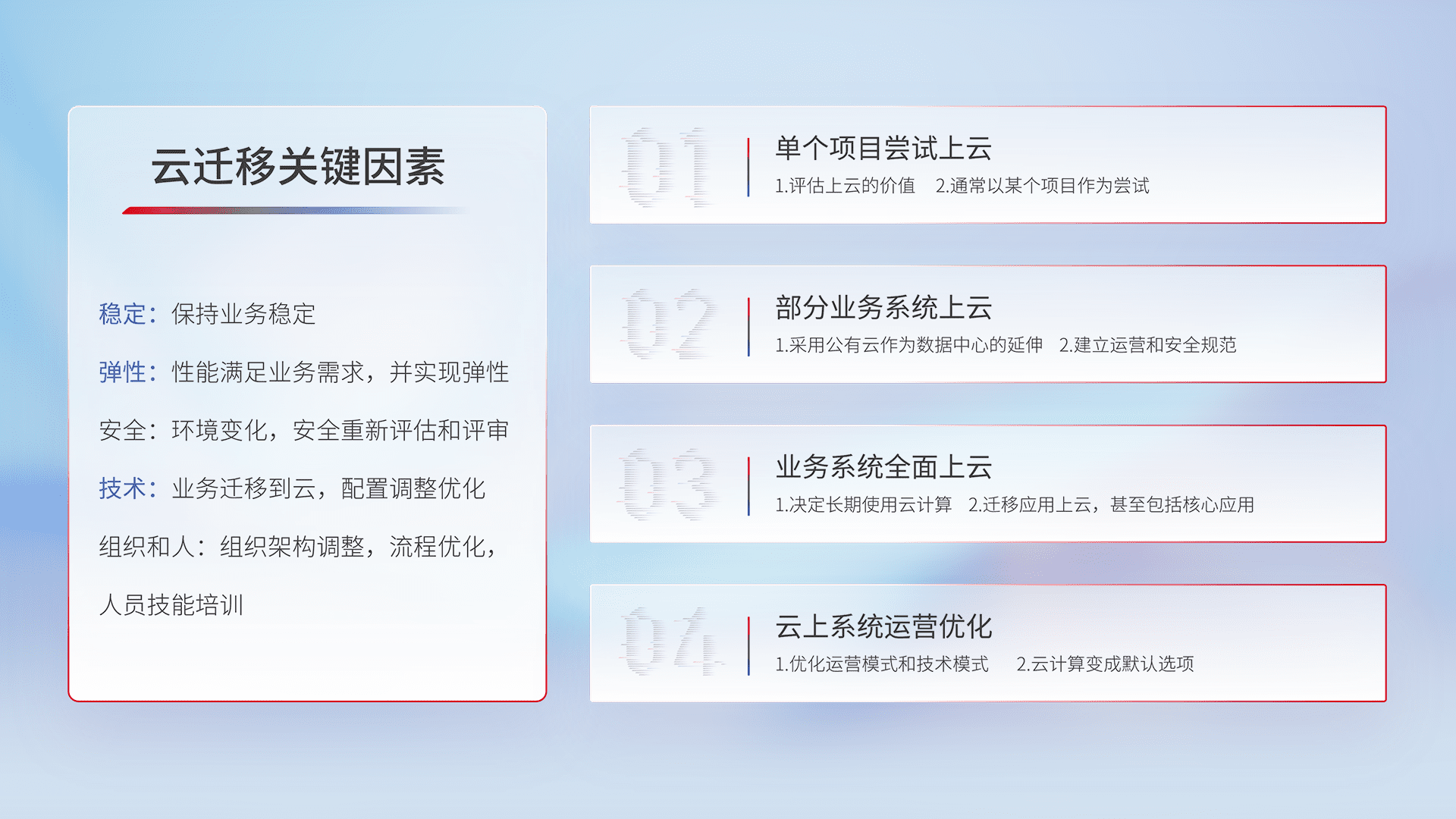 结合实际业务,,,,从规划设计、、云平台选型、、、、云原生改造、、数据迁移、、、、集成交付,,,,迁移全过程为客户识别最佳上云路径,,做好风险识别管理,,,,设计网络架构、、、、身份权限、、、、安全审计合规、、、操作审计、、日志审计、、、、监控告警策略、、、、多站点容灾设计等,,,对云上基础设施进行整体规划,,,,提升IT治理水平,,,,以满足弹性、、、、高可用、、、高性能的需求。。