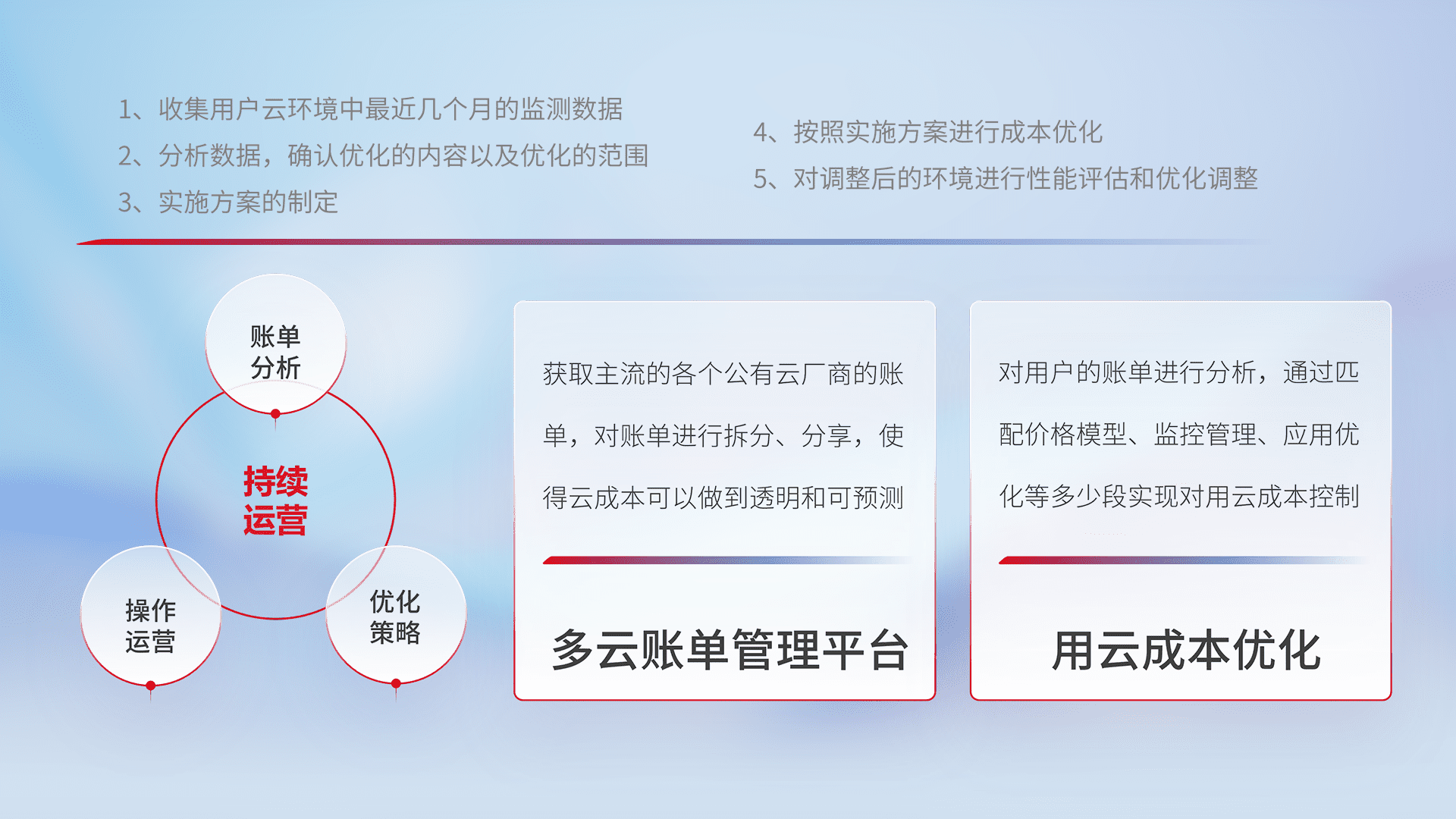 通过多云纳管,,,以统一的资源数据模型把客户的云资源进行抽象和封装,,,,进而实现对多云资源的统一操作,,保障云资源管理的可靠性、、、稳定性与可用性。。。。量身定制化运维内容,,,,配置、、、开发运维、、补丁管理、、、、备份、、、监控、、、、认证和访问管理、、、审计和日常巡检等,,,保障在用云过程中的可靠度,,稳定度以及高可用率。。。